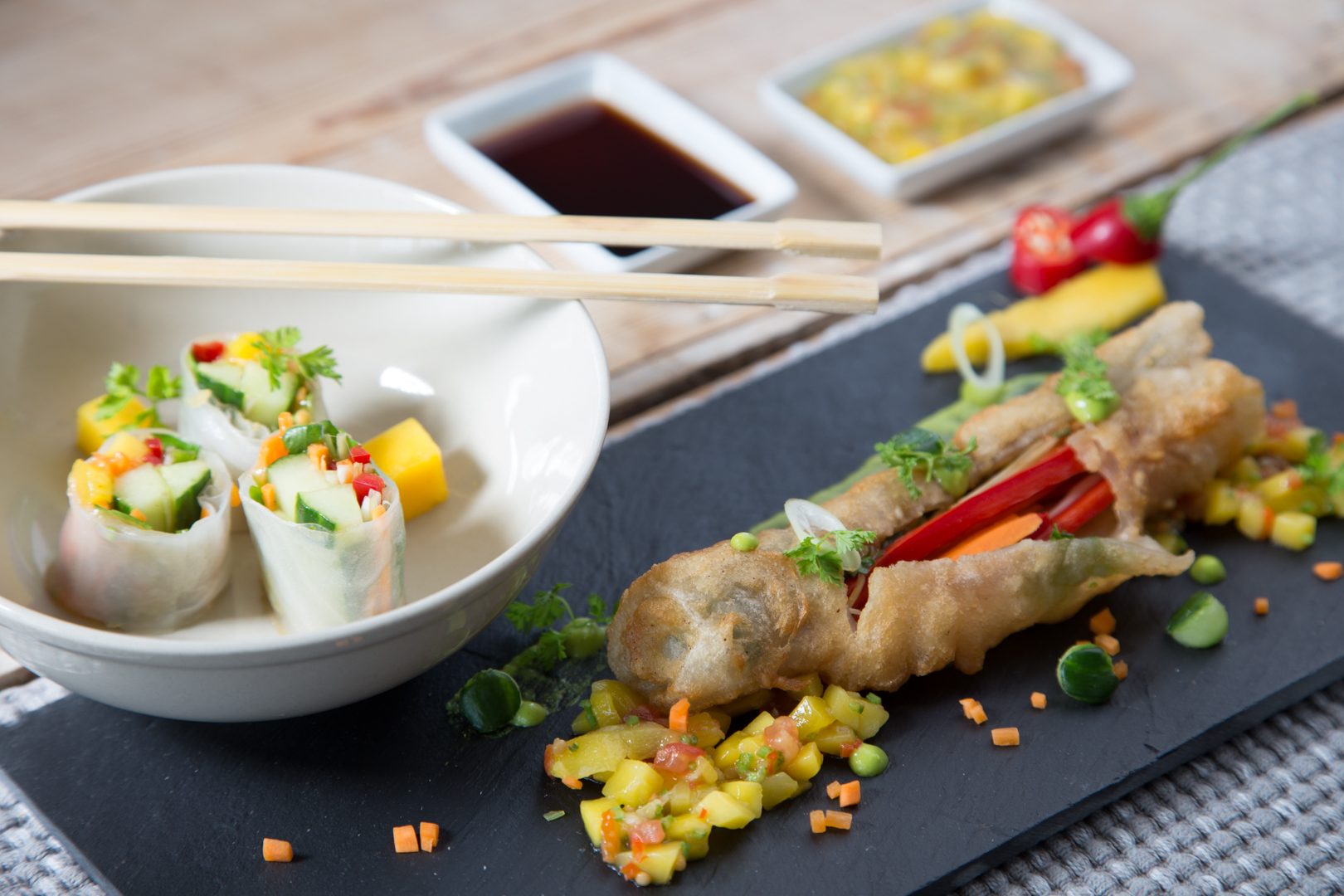 Für die Sommerrollen Gemüse waschen und längs in dünne Streifen schneiden. Reisblatt für 1 Minute auf einem flachen Teller in Wasser einweichen lassen, herausnehmen und nach Herzenslust Gemüse, Kräuter (z.B. Minze, Koriander) und Röstzwiebeln hinzugeben. Mit Sojasauce und Sesamöl beträufeln und einrollen.